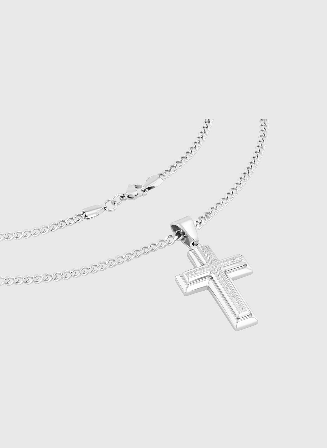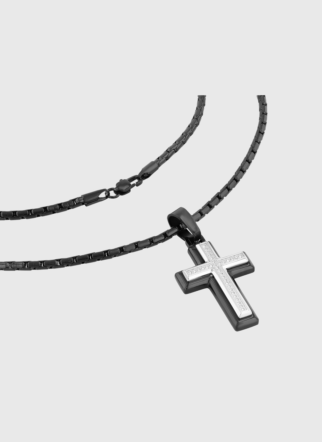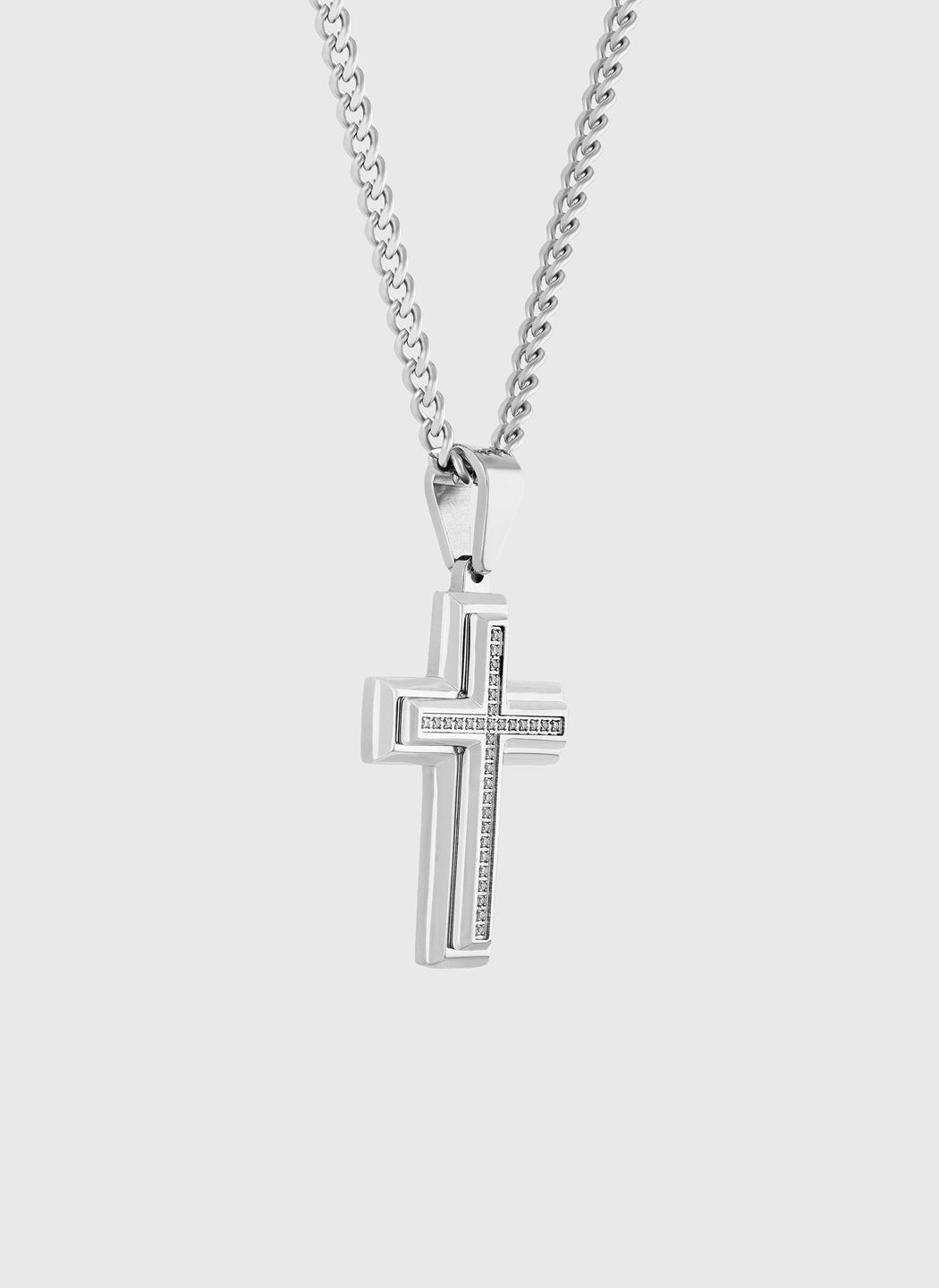 Defined by strong interior lines and balanced proportion, the Division Diamond Cross Pendant is set with white diamonds totaling 1/10ctw, introducing quiet light and depth. Polished stainless steel frames the form with layered structure, creating contrast through precision rather than ornament. Composed and modern, it is designed for enduring, everyday wear.