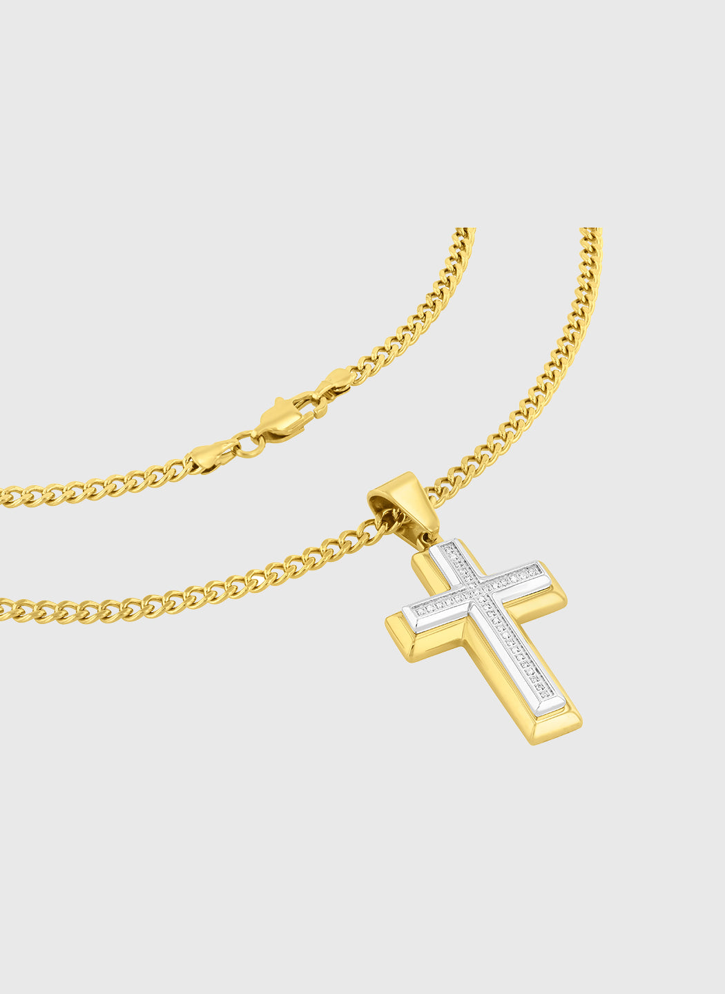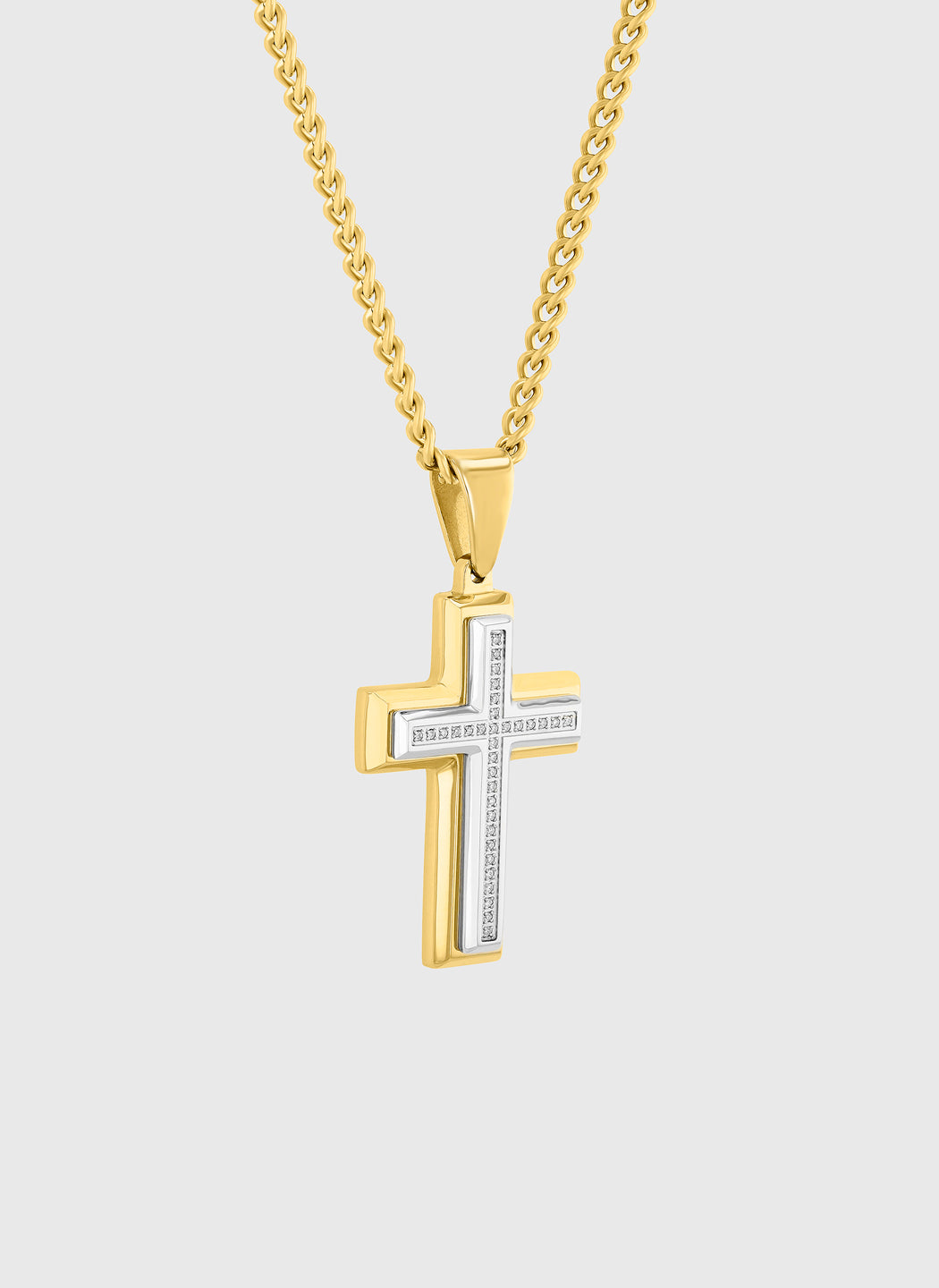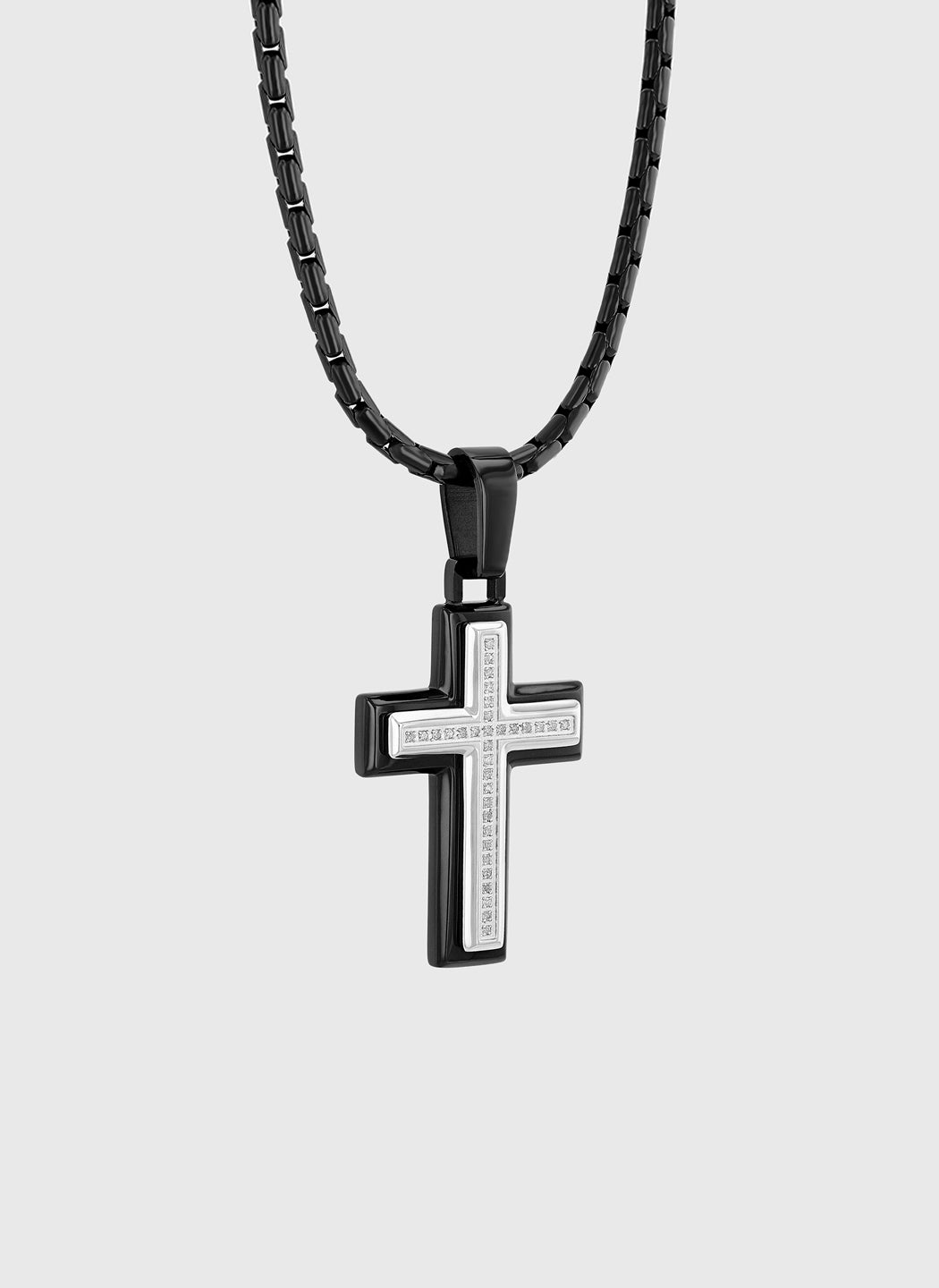 Defined by strong interior lines and balanced proportion, the Division Diamond Cross Pendant is set with white diamonds totaling 1/10ctw, introducing quiet light and depth. Polished stainless steel frames the form with layered structure, creating contrast through precision rather than ornament. Composed and modern, it is designed for enduring, everyday wear.