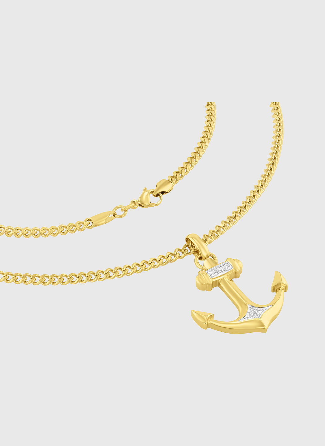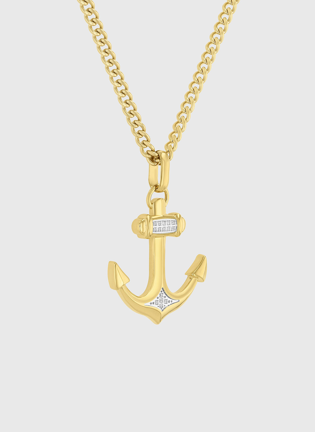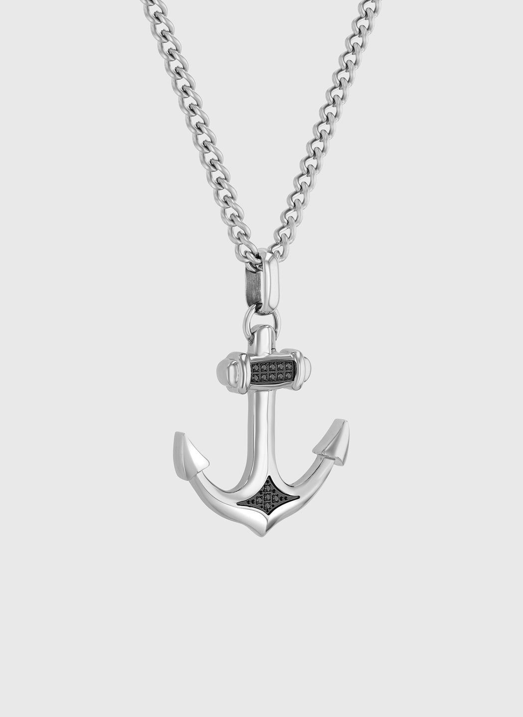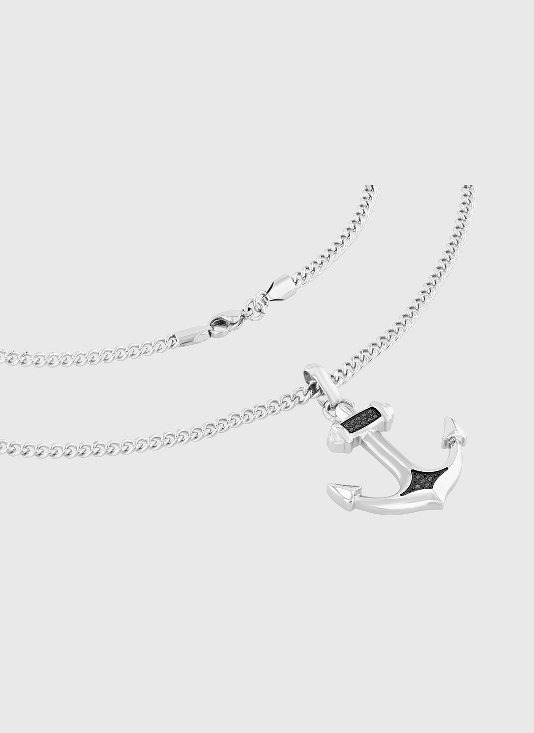 Crafted from polished stainless steel with a deep black finish, this anchor pendant is set with black diamonds that add subtle depth to its clean, sculpted form. The balanced design gives the piece a composed, modern presence on the chest.