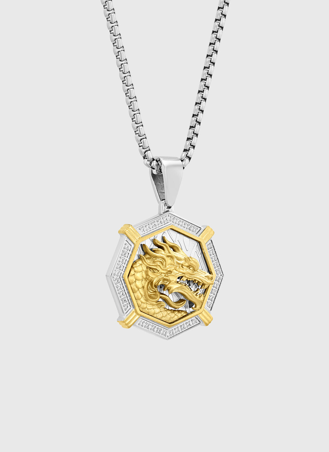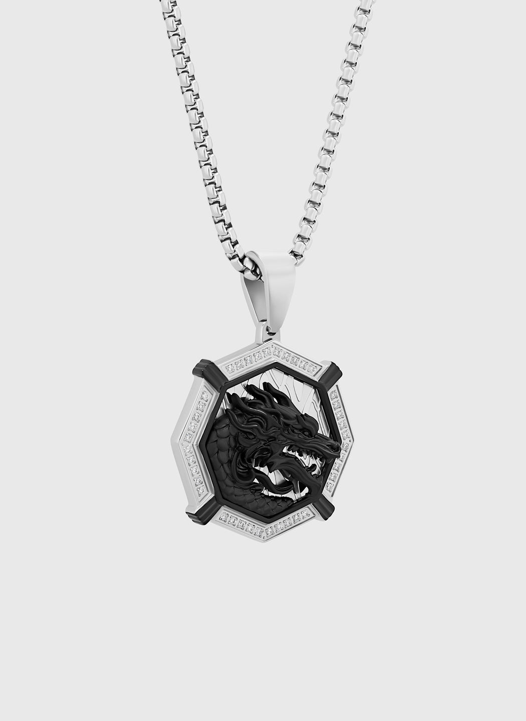 Anchored by a sculpted dragon motif, this medallion is framed with diamond accents totaling 1/4ctw, adding measured brilliance and contrast to the design. The layered hexagonal silhouette introduces depth and architectural structure, creating a bold yet refined presence on the chest. Offered in three distinct variations, the piece maintains a strong, modern profile while remaining versatile for everyday wear.