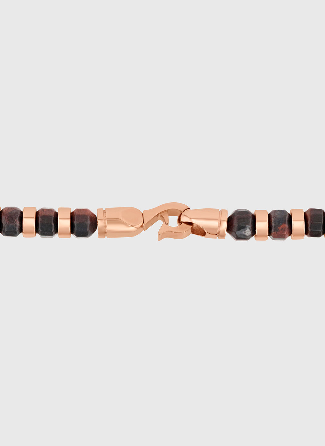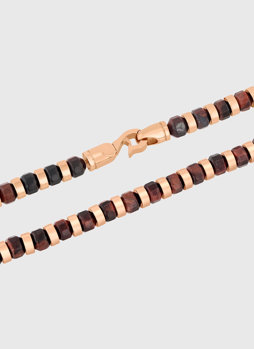 Polished tiger’s eye beads are paired with warm rose-tone stainless steel details, creating a look that feels both textured and quietly refined. Designed to wear effortlessly on its own or layered, it brings a subtle depth and character to a modern jewelry collection.