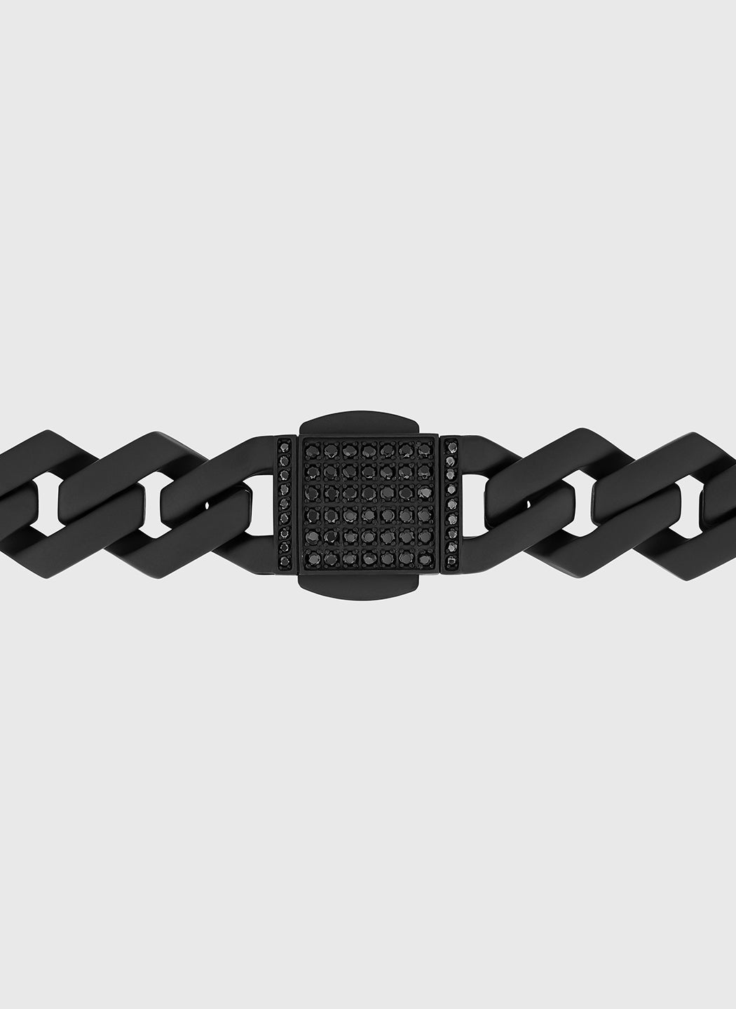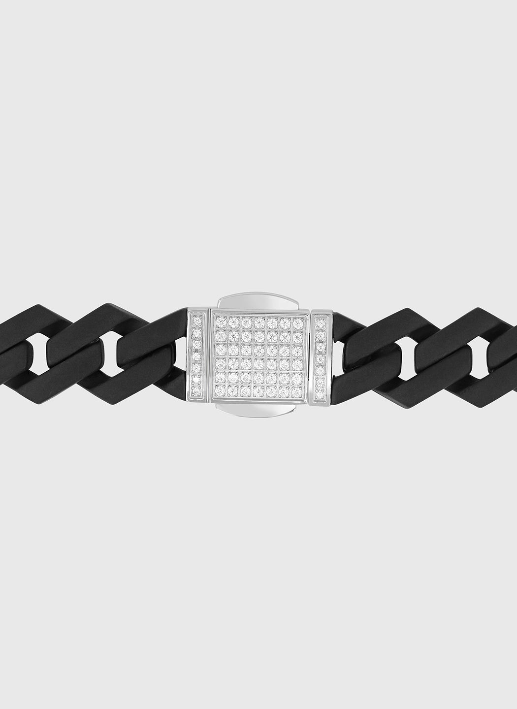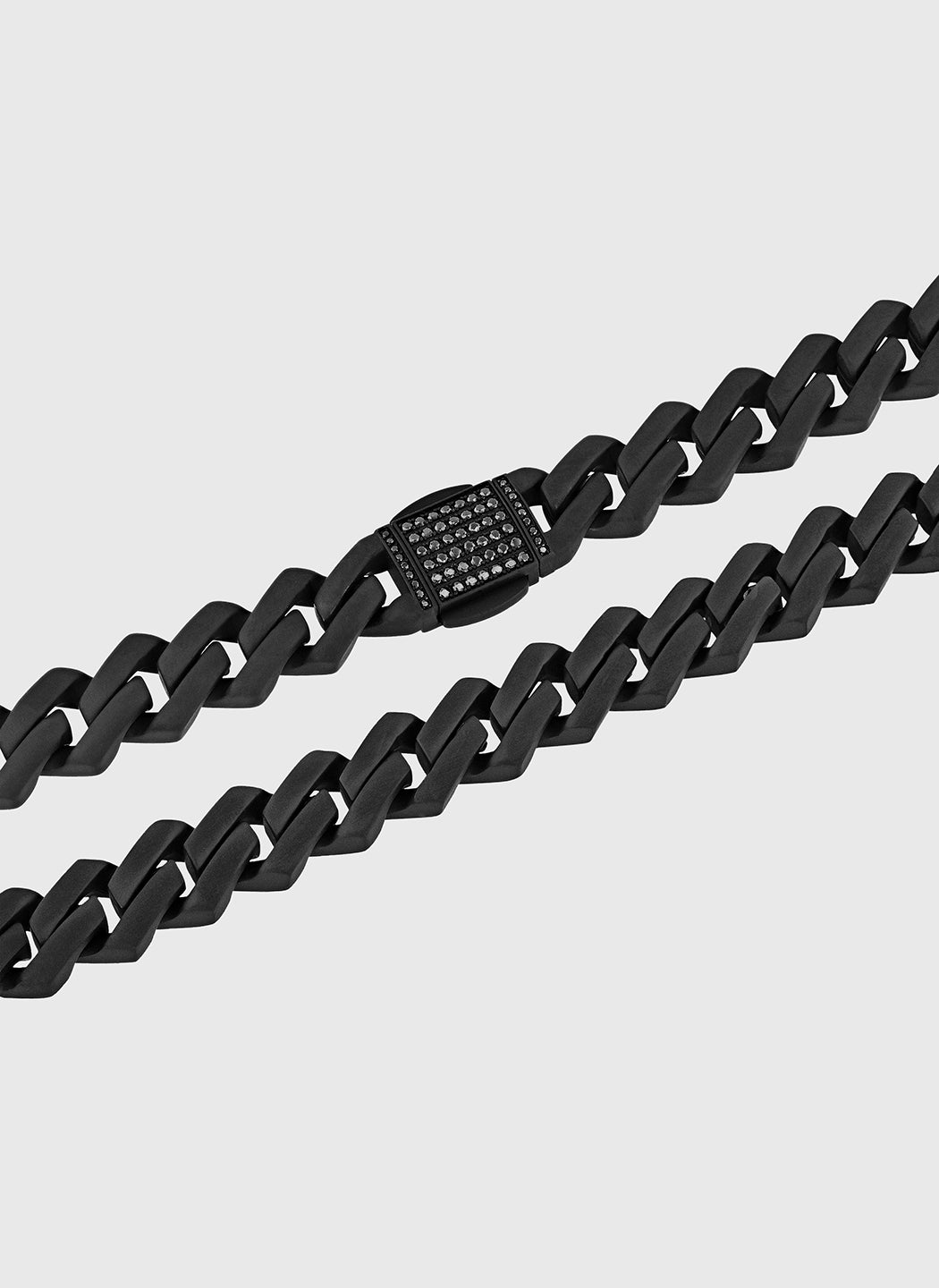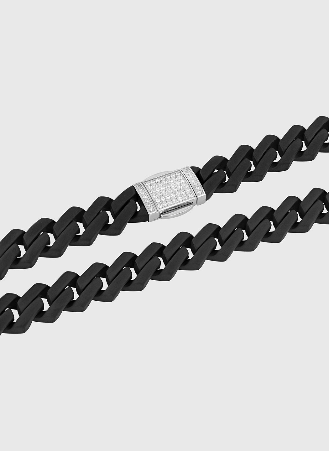 Deep matte stainless steel links lead to a sculptural clasp set with white or black diamonds totaling 1/2ctw, introducing controlled light against the dark surface. The considered proportions and architectural structure give the necklace a composed, enduring presence, suitable for either color variation.