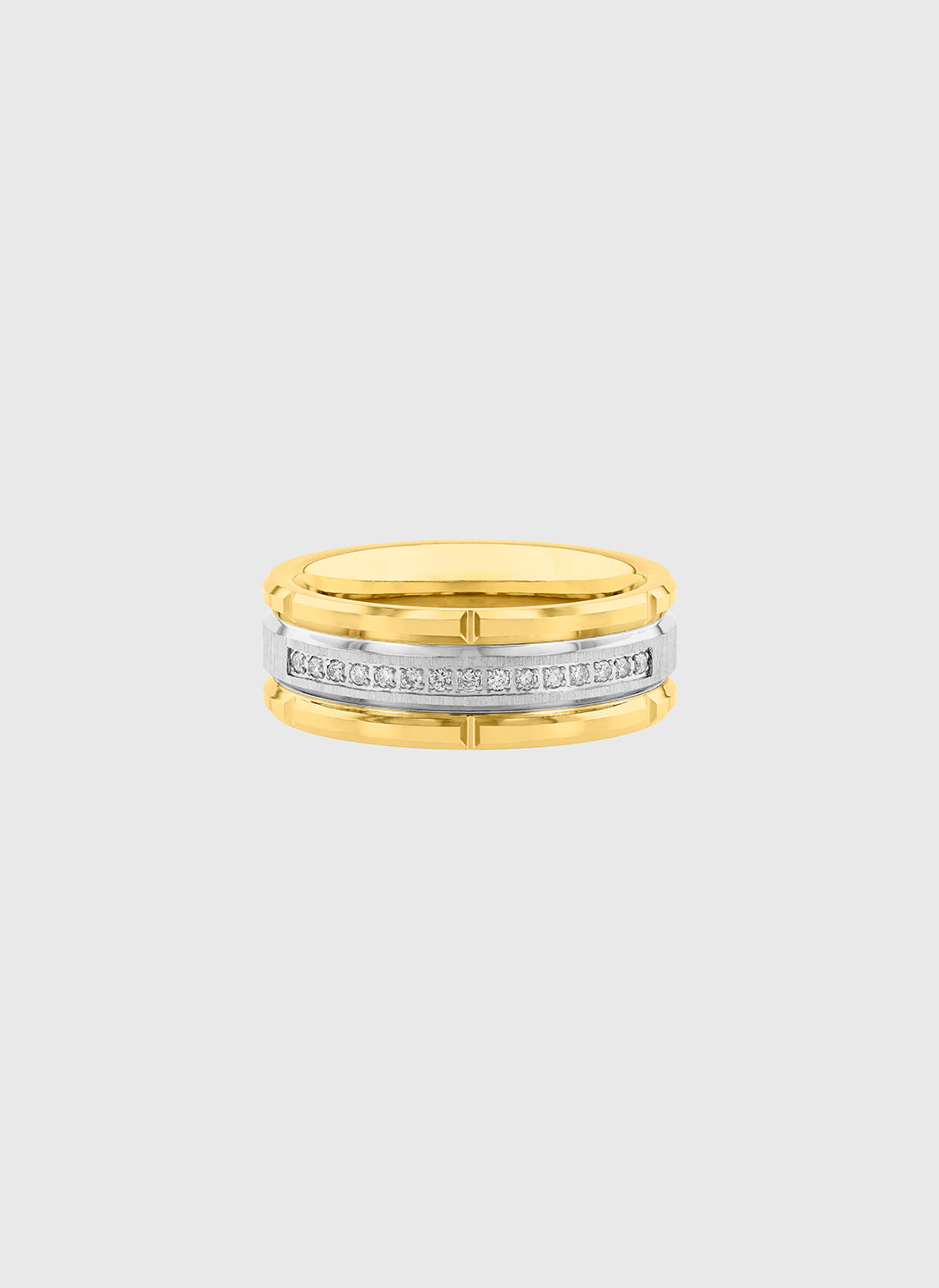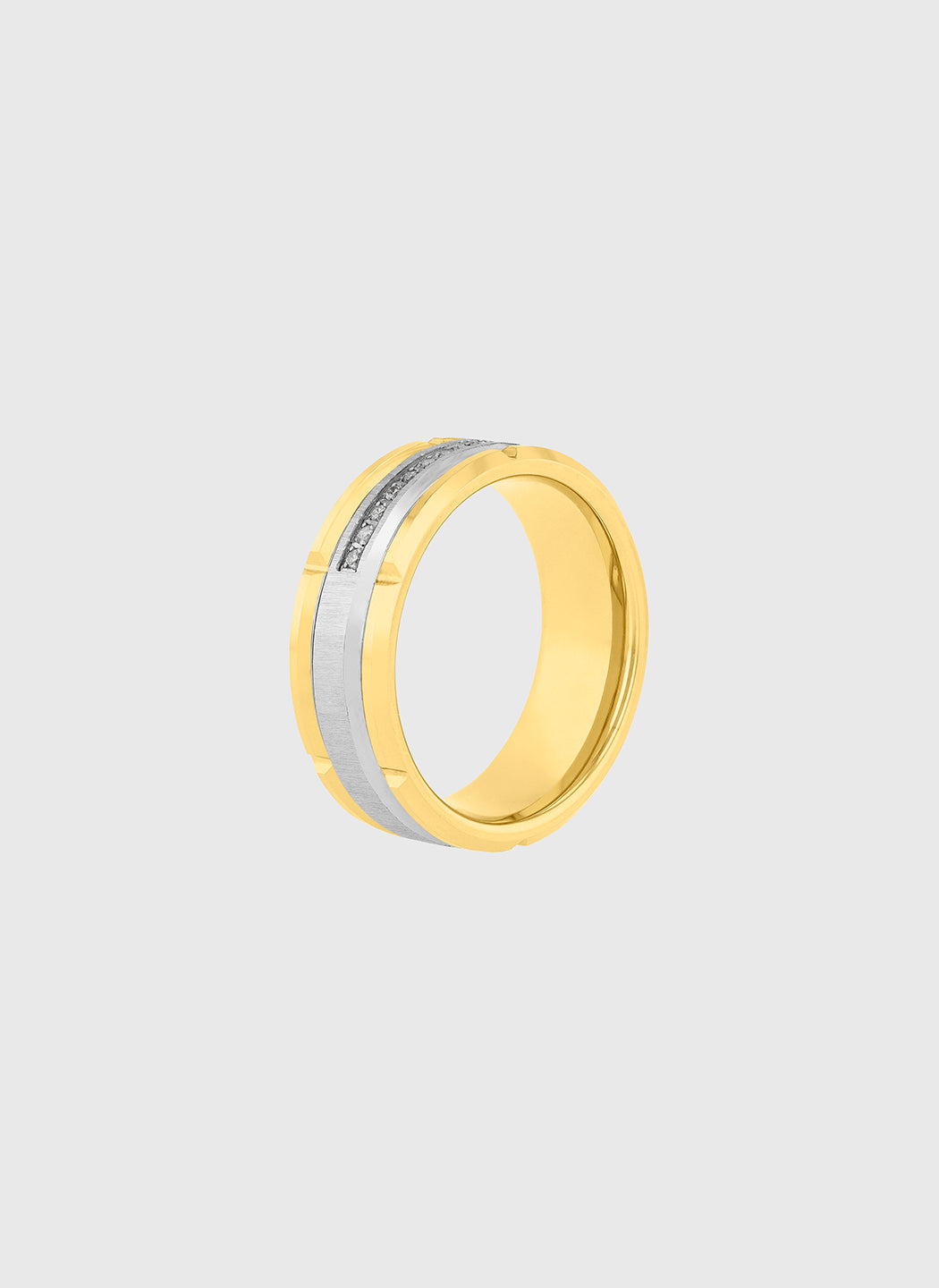 A polished gold finish and refined diamond accent line define this tungsten band, with .10ctw of diamonds adding subtle brilliance along the surface. Elegant in proportion and deliberate in detail, it reflects a modern expression of luxury that feels natural on the hand.