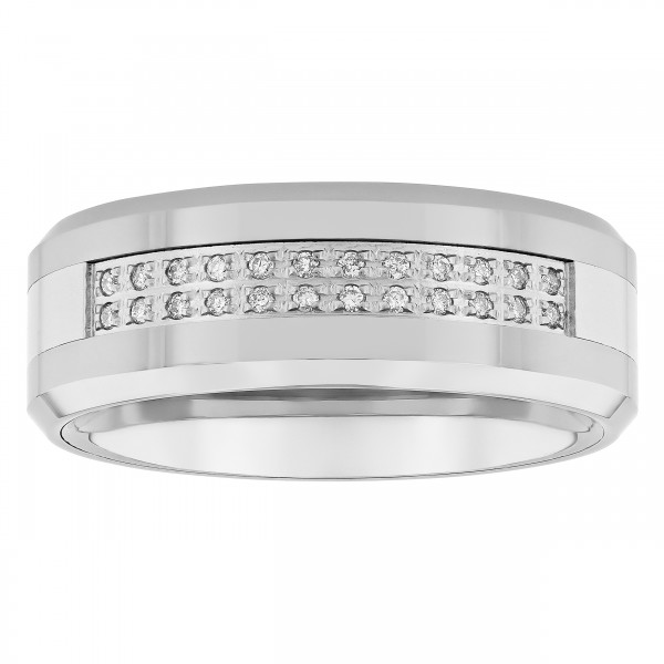 This ring's beveled design is built to stand out among even the finest tungsten wedding bands. It's completed by a double row of diamonds at the center.